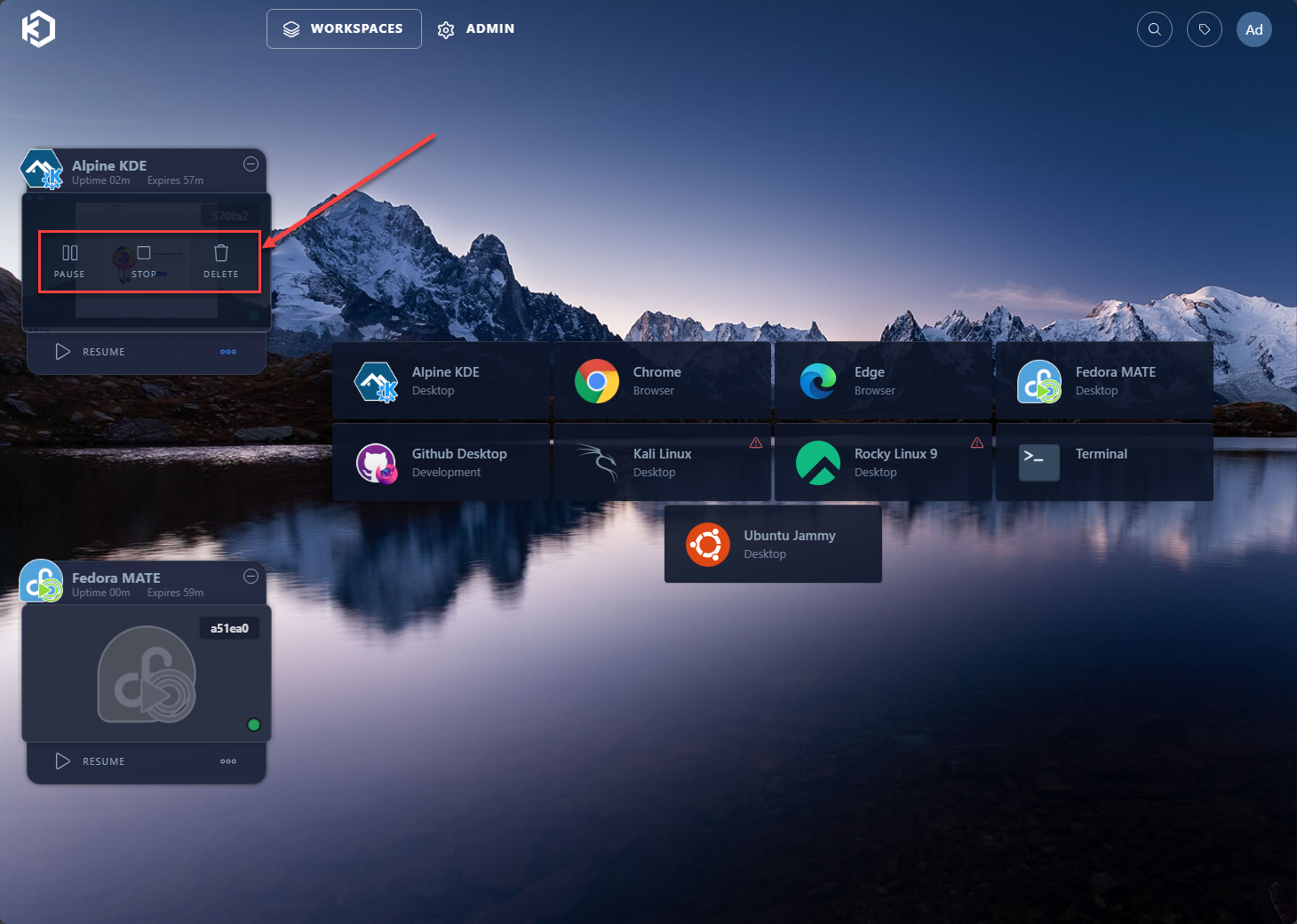 As you can see below, I have launched a few workspaces for the admin user and when I navigate back to the workspace dashboard, Kasm asks you what you would like to do with the workspace.