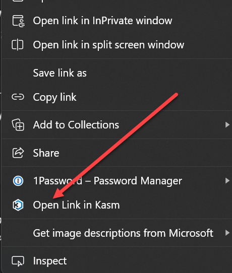 When you install the Kasm Open In Isolation browser plugin, you will then get the following new right-click context menu integration when you right-click on a link: