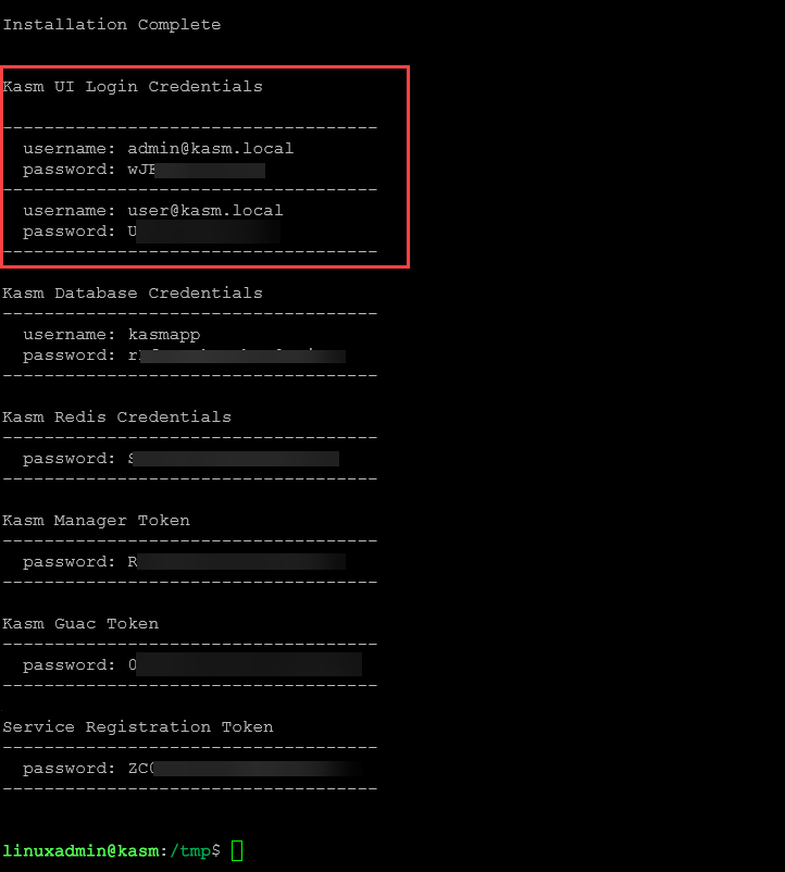 After a few minutes, the solution should be installed. It will display the administrator and user accounts and their passwords that have been set. Take note of the username and password as you will need these for logging into the Kasm workspaces (machines, apps, etc).