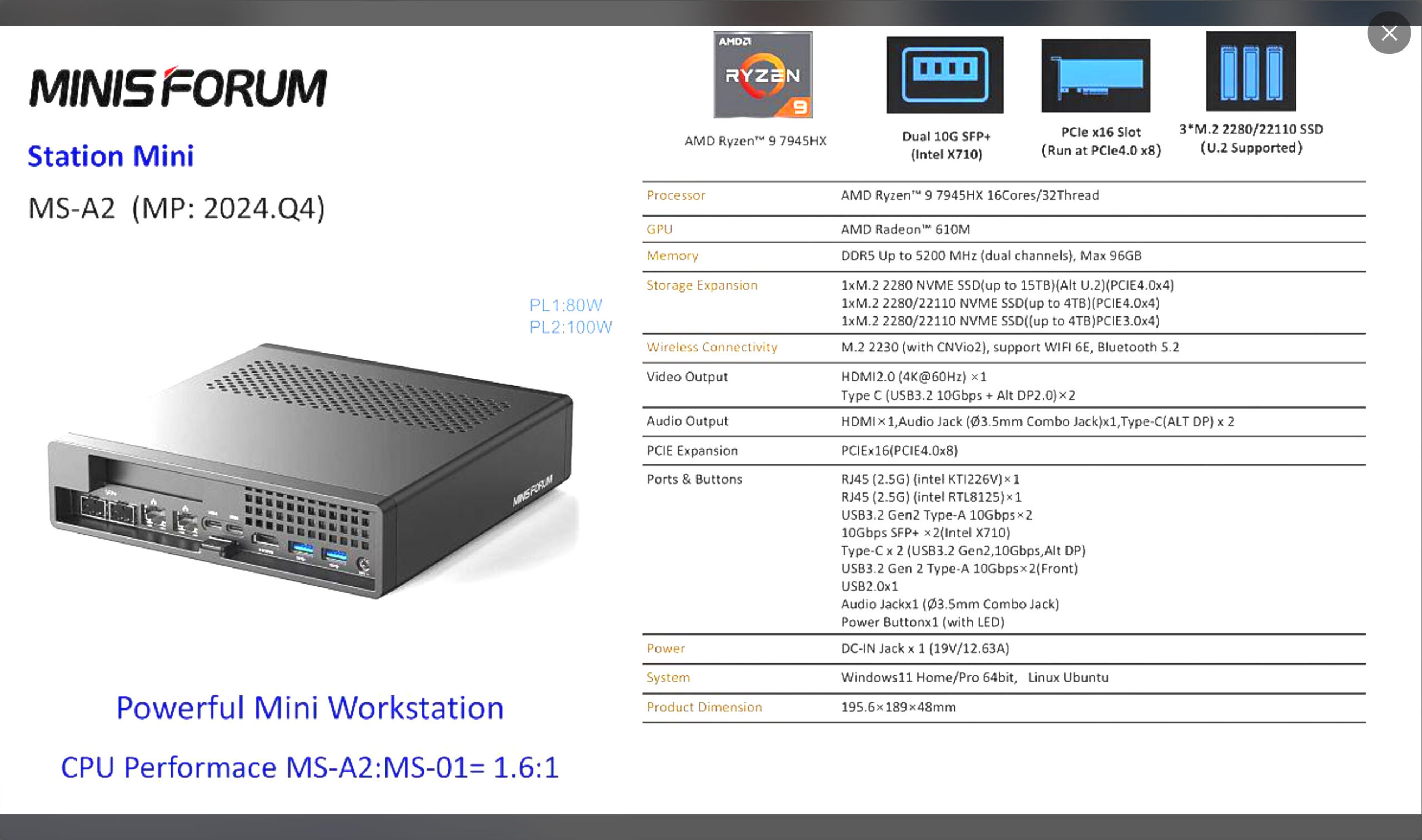 This is the updated version of MS-A1/MS-01. This is definitely what I think is the best mini PC in mid 2025. The MS-A2 is a uniform processor configuration with two CPU choices that can be chosen from. The MS-A2 can be configured with the Ryzen 9 7945HX processor or the Ryzen 9 9955HX processor.