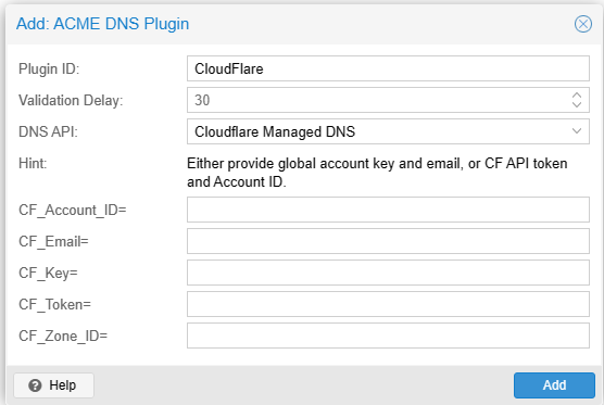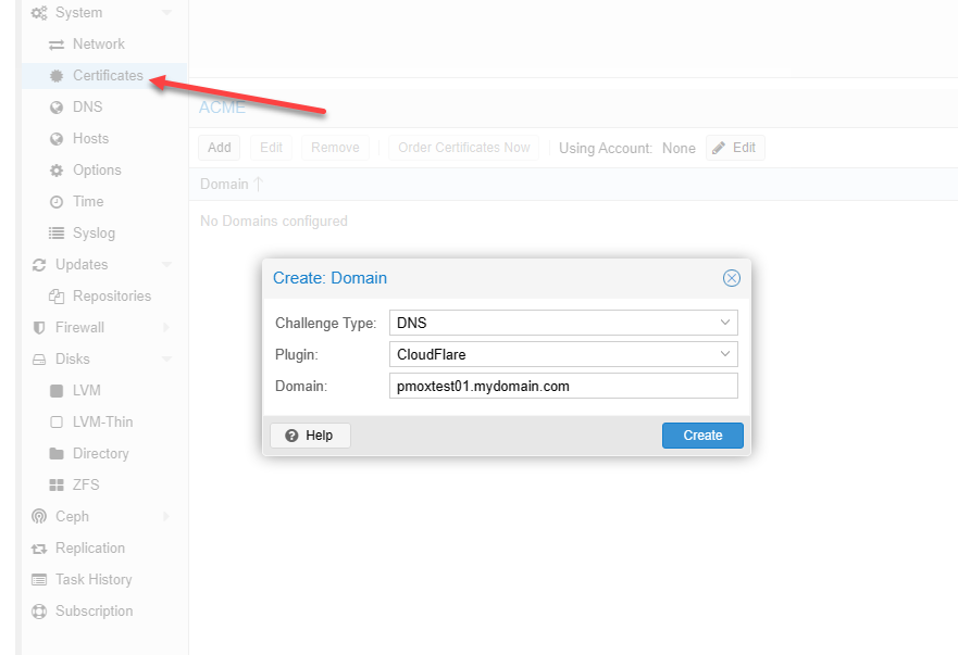 Then, under your host, you will choose DNS challenge (most likely) and your plugin, along with your domain name for your PVE host.