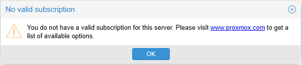 Even after reporting your update repositories to the non-subscription repos, you will see the subscription nag every time you log into Proxmox: