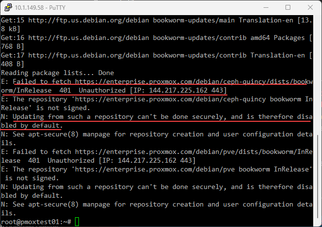 By default, when you install Proxmox VE, it will come out of the box, pointing to enterprise subscription reports. If you attempt to update your Proxmox VE Server, you will get errors related to being unable to connect to the repos. The error will look something like this: