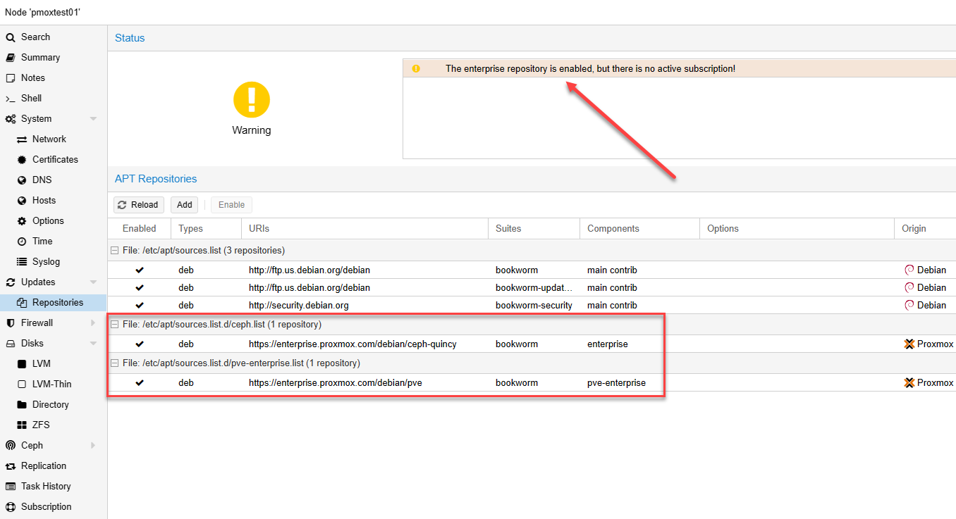 We can also view this in the Proxmox GUI at the Proxmox host > Updates > Repositories. You will see the warning below about the enterprise repositories without a subscription.