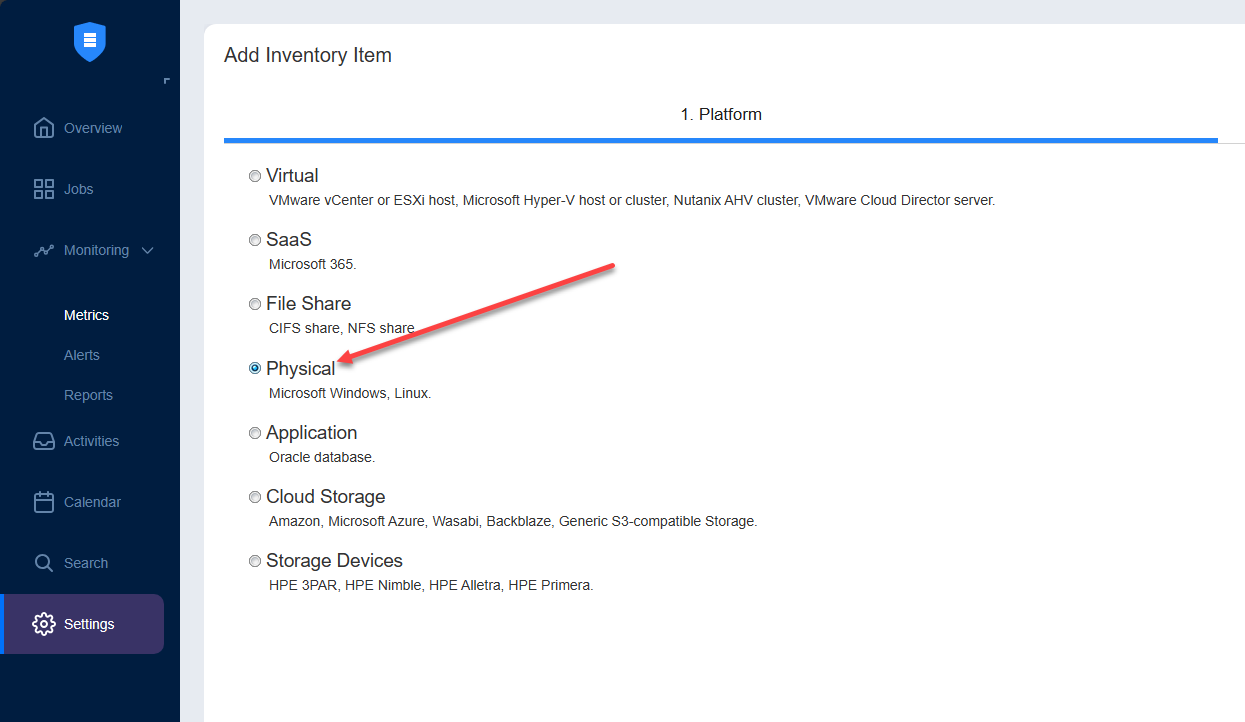 As you can see below, you won’t see “Proxmox” listed under the Virtual option. Rather, we choose Physical.