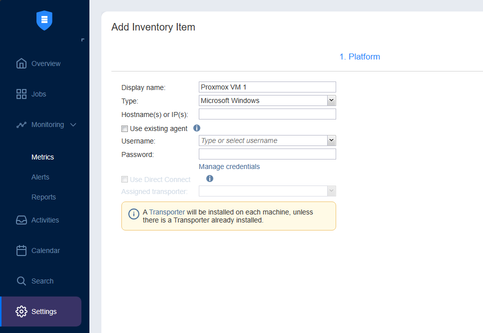 Then, you simply add the VM that you want to protect via the agent installation of the NAKIVO Transporter.