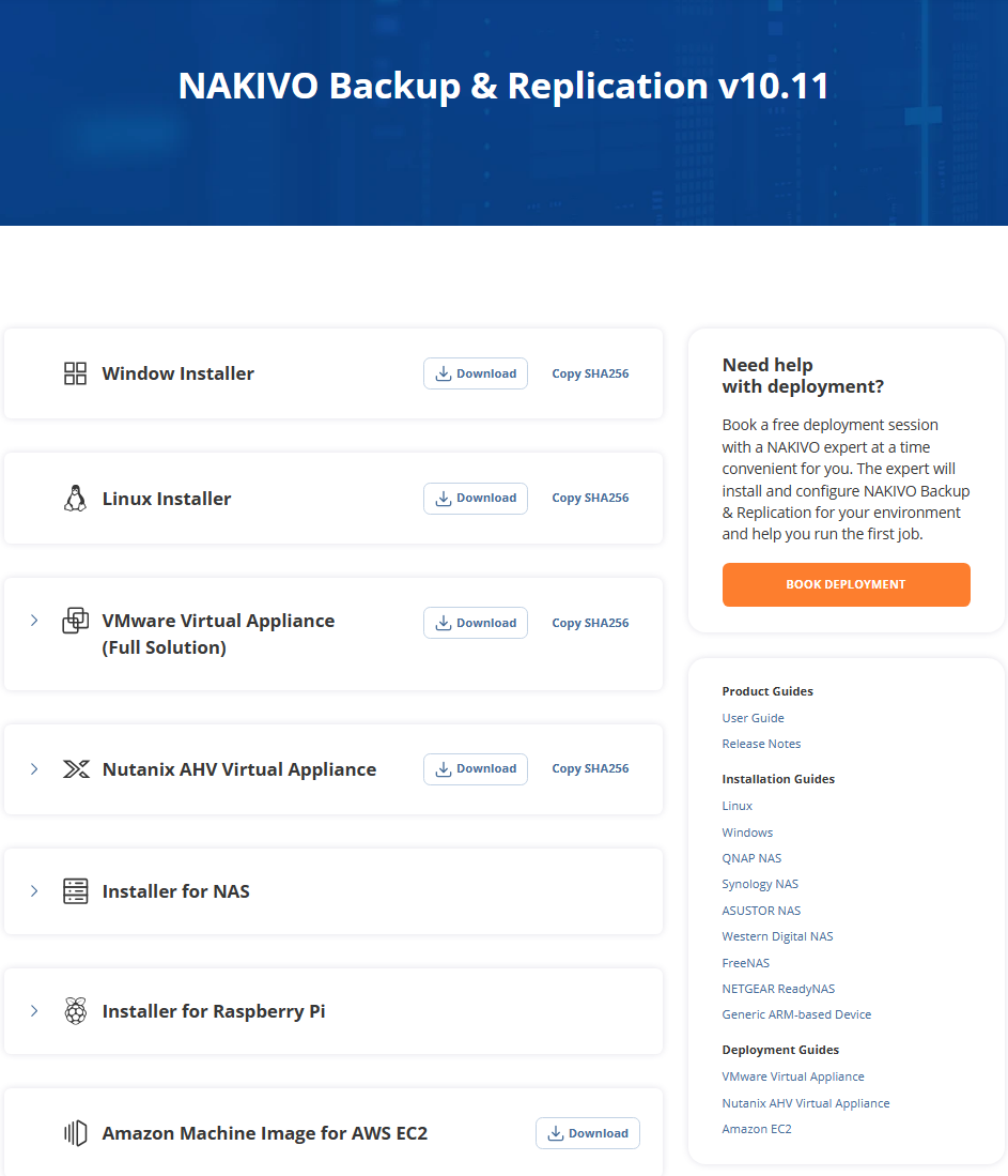I also really like they have a NAS option for running NAKIVO. You can easily run it on your Synology Asustor FreeNAS or other approved NAS appliances. Another noteworthy option for running NAKIVO backups is utilizing the power of the cloud, allowing for greater flexibility and scalability in your backup infrastructure. vendors. Note the following download options: