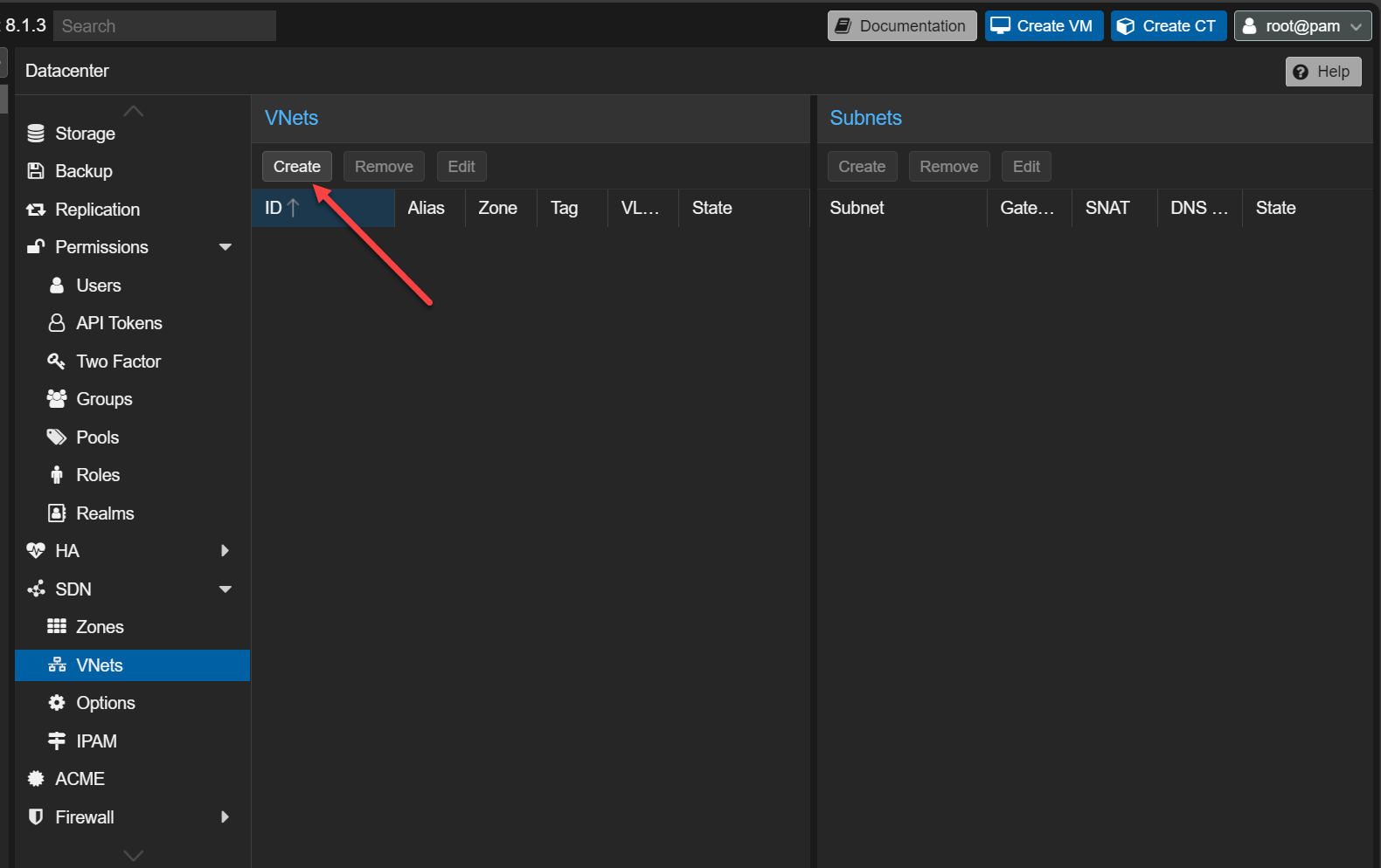 Next, we need to create a VNet in PVE. Navigate to the VNet menu under the SDN menu and click to Create a new VNet.
