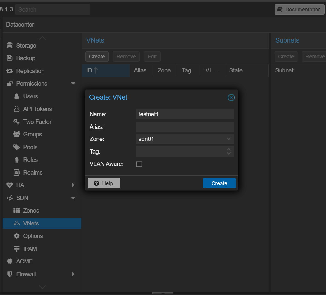 Create a name for the VNet and select the Zone we created above. You also have the option to make these VLAN aware with a tag and also create an alias.