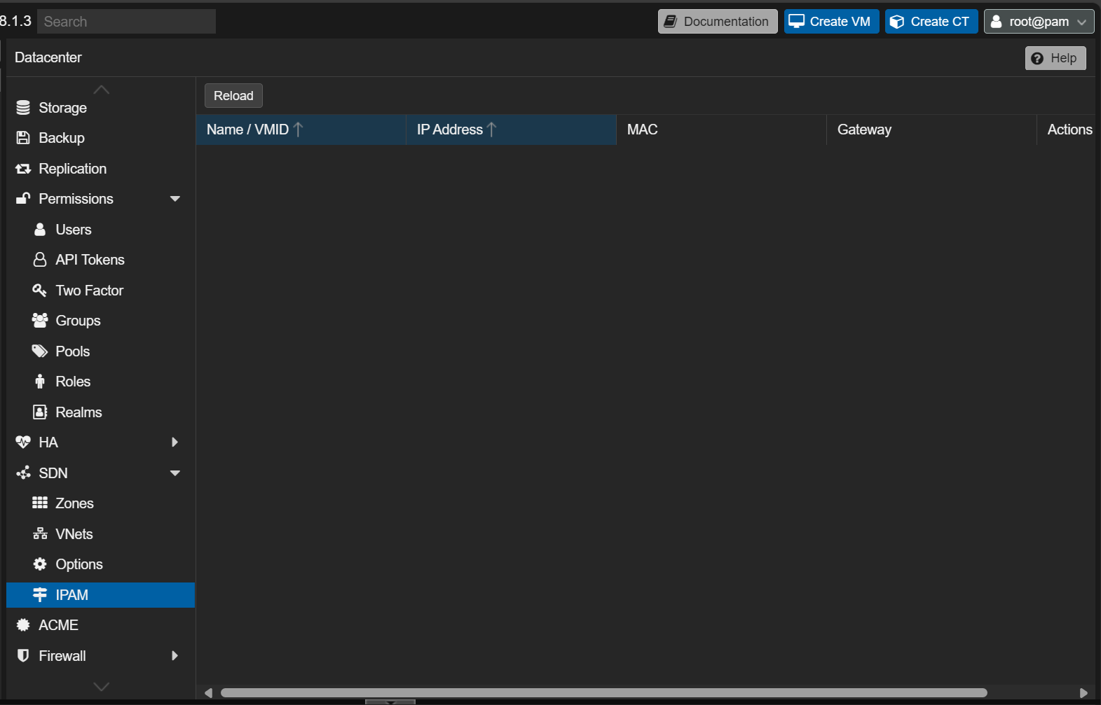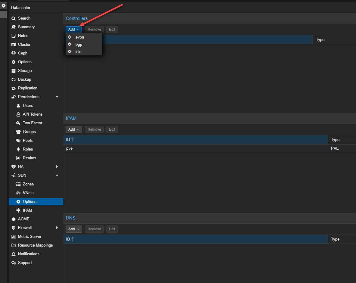 We are not setting anything in the Options screen or IPAM. However, let’s take a look at what those screens look like. Under the Options screen and the Controllers section, we can add network controllers for more advanced configurations like VXLAN to configure network tunnel configurations between peers, which are the Proxmox nodes. Under the Controllers section, we can add EVPN, EBGP, and ISIS.