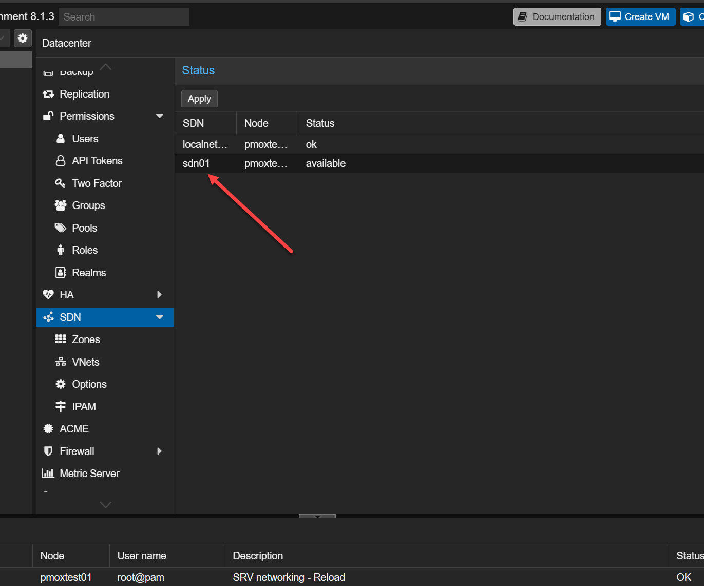 It is very important to understand that creating the configuration we have created does not apply the configuration. It only stages the configuration so to speak. You need to click the SDN parent menu and click the Apply button.