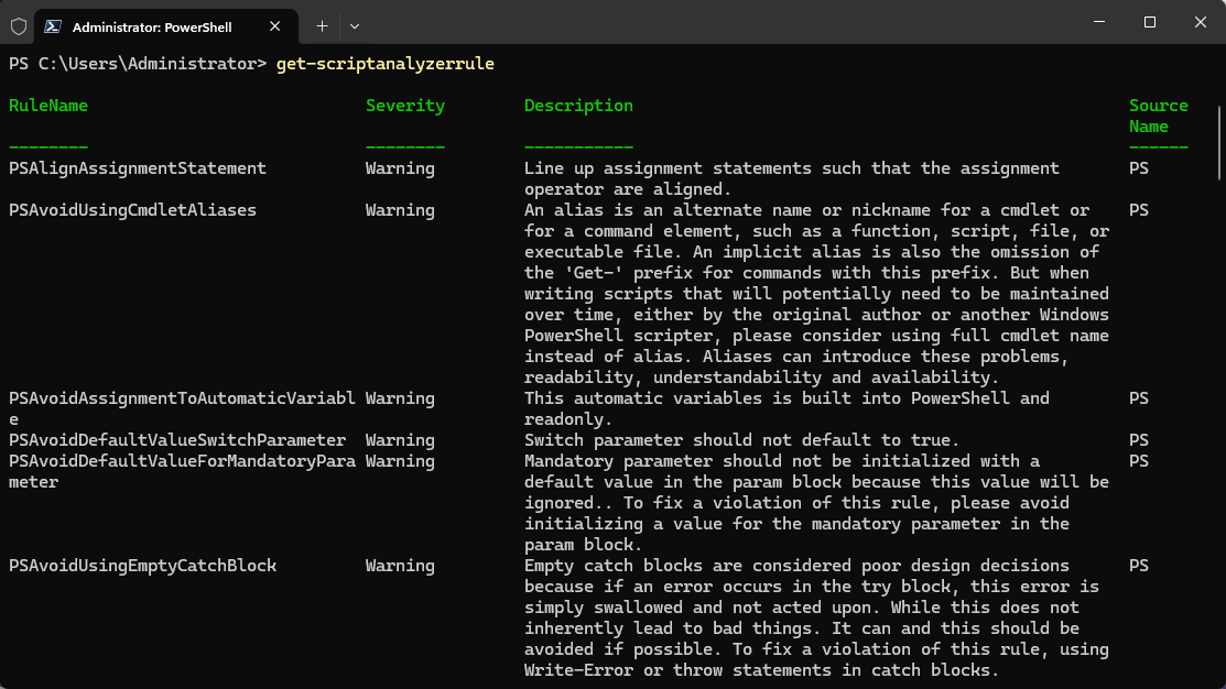 There is a wide range of things the module checks for, and findings will result in informational warnings or error statuses. Note some examples of findings and guidelines you can receive with PSScriptAnalyzer and their severity to improve formatting, code performance and efficiency, security, and maintainability. You can find the full Microsoft documentation here: PSScriptAnalyzer Module – PowerShell | Microsoft Learn.