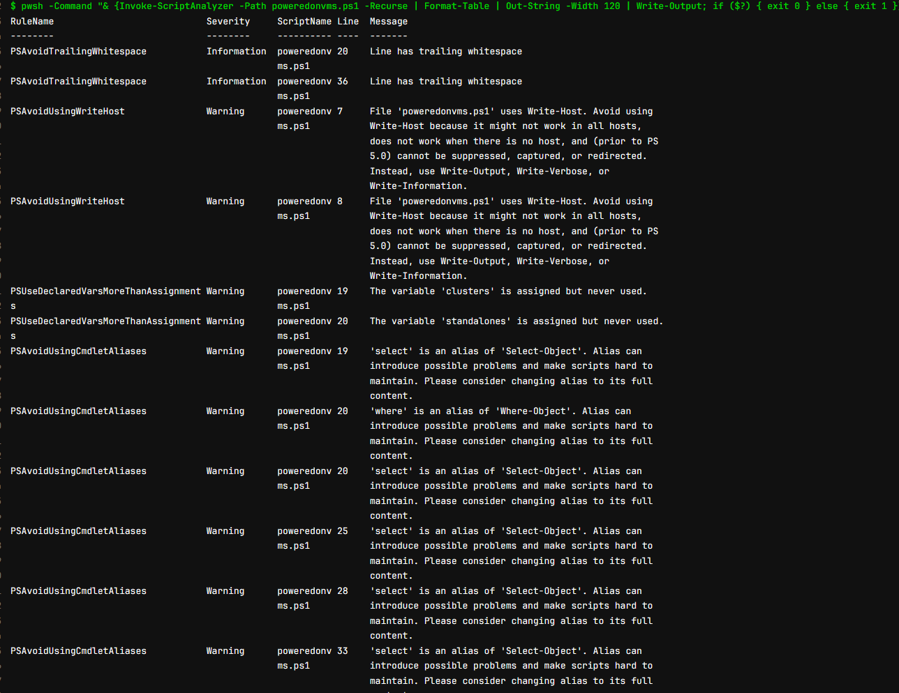 - pwsh -Command "Invoke-ScriptAnalyzer -Path myscript.ps1 -Recurse