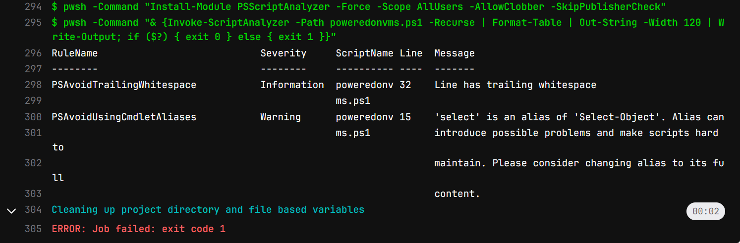 You can also use it as a stage in your CI/CD pipelines running PowerShell code to have the linting stage run before the code actually does anything in the environment. If errors or other bad code artifacts are detected, your CI/CD pipeline will fail the stage before it moves on to other aspects of the pipeline.