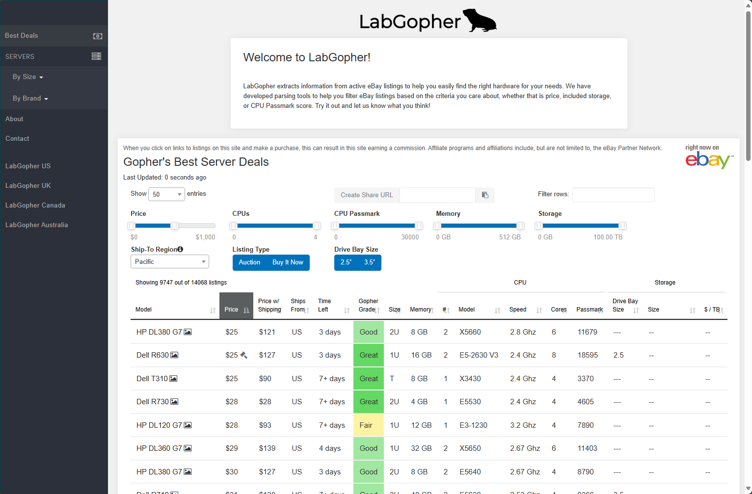 Another great resource I have shed light on a number of times is Lab Gopher. Lab Gopher is a site that scrapes EBay for the best server deals and what is great about it is it allows you to specify the hardware configurations you are looking for and it will display matching EBay results for that particular configuration.