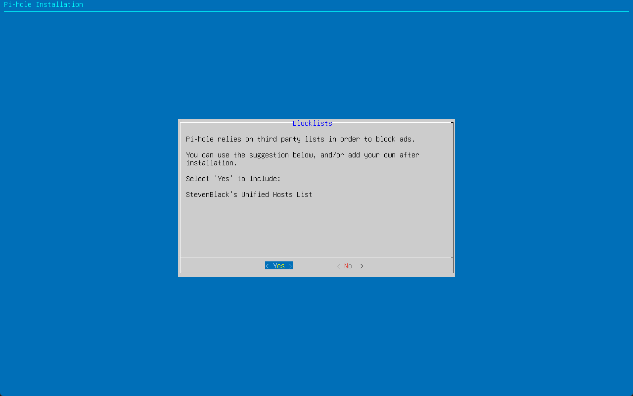 You will see the next page noting that Pi-Hole relies on third-party block lists. It will install StevenBlack’s Unified Hosts List by default if you select Yes.