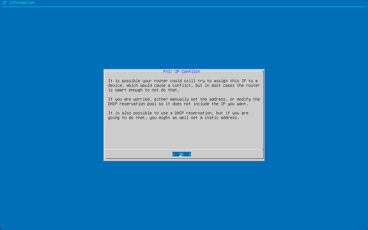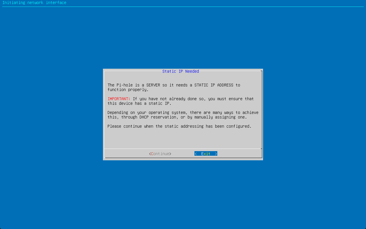 You will see the following notice about any possible IP address conflicts. Pi-Hole is here just saying if you configure a static IP address, you need to make sure if it is within a DHCP range that you have a reservation for that IP address or there will be the potential for IP address conflicts.