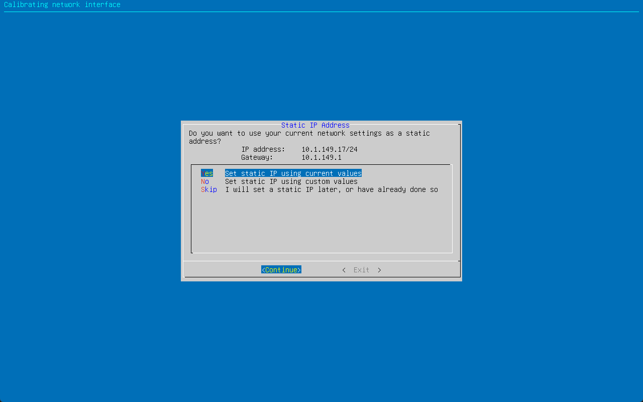 You will see your current IP address configured displayed. I have a static IP address configured. It will display that and ask you if you want to use the current settings or set a new static IP address.