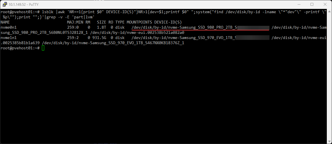 This command allows you to list disk by ID ata identifier. In the command output, we are looking for the identifier that starts with /dev/disk/by-id. Since I know it is a Samsung 980 Pro NVMe drive that I am passing through, I can easily identity it by the name.