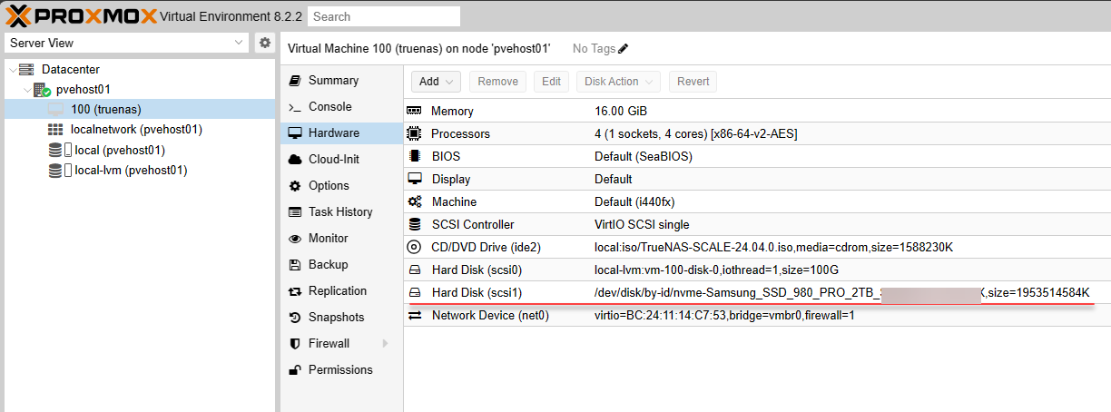 In the Proxmox web UI, we can also check the hardware configuration to see the VM hard disk with the correct identifier has been passed through.