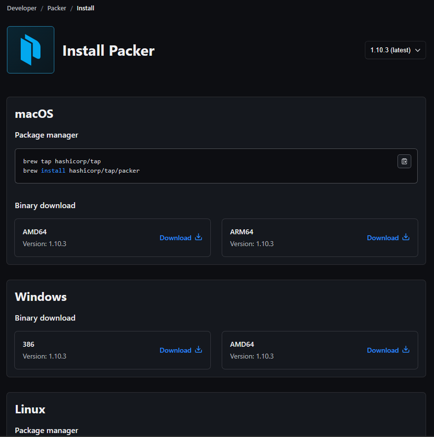 The first thing you need to do is download Packer and the vSphere ISO plugin. You can download the latest version of Hashicorp Packer here: Download Packer. Select the binary for your specific platform.