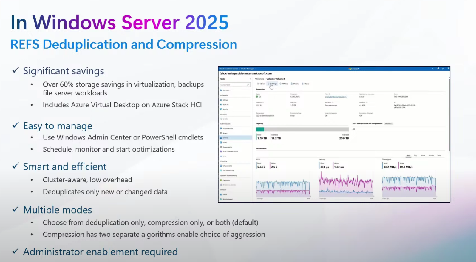 Windows Server 2025 uses deduplication and compression to reduces data redundancy and optimize storage space. When you have workloads that have redundant data and reused data blocks, like running very similiar virtual machines with the same operating systems, the space savings can be huge. Backups are another example of storage that can greatly benefit from deduplication and compression.