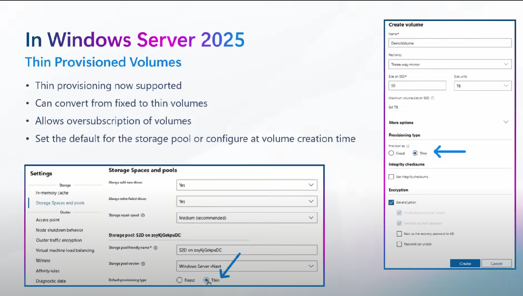 This is a great feature that is finally coming to Windows Server 2025. With faster flash and NVMe storage, thin provisioning is now the recommended way to configure your storage so you can allocate the overall space and only use the space on disk that is actually written.