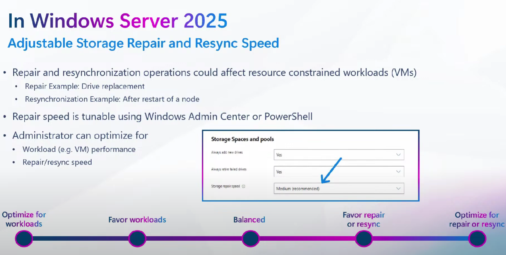Windows Server 2025 introduces adjustable repair and resynchronization settings. Administrators can now fine-tune the repair process. This can help strike a balance between maintaining VM performance and bolstering data integrity.