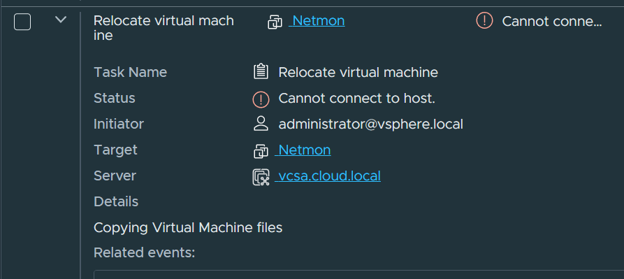 One of the mini PCs had no issues (MS-01). However, the other mini PC (Trigkey S7 Pro) kept failing to receive the storage vMotion traffic for some reason. The error is below as I snagged it from the tasks screen for vCenter Server to show.