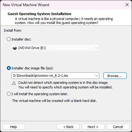 You will need to have the Proxmox virtual environment ISO image downloaded ahead of time. Once you download the ISO image, you can point to the ISO on this screen. Click Browse and select the ISO. Then click Next.