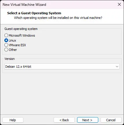One the guest operating system screen, select Linux and then under the version, select Debian 12.x 64-bit.