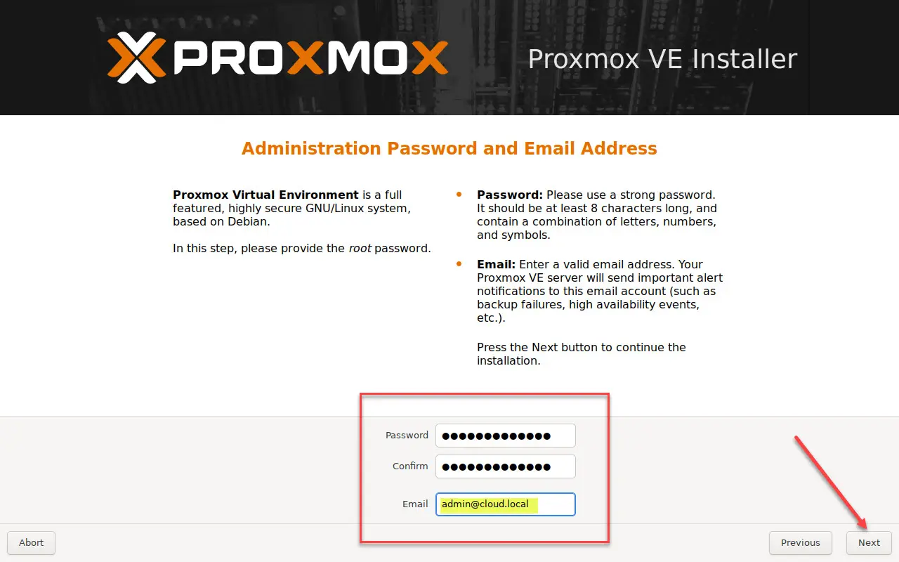 Set the administration password and email address. You can use a fake email address for your lab environment. Just make sure it follows proper email address formatting. Click Next.