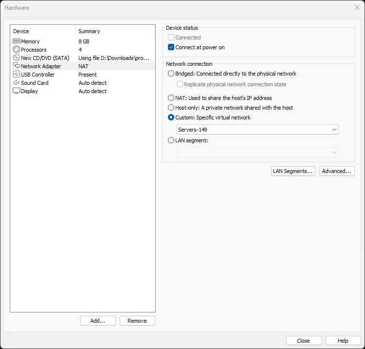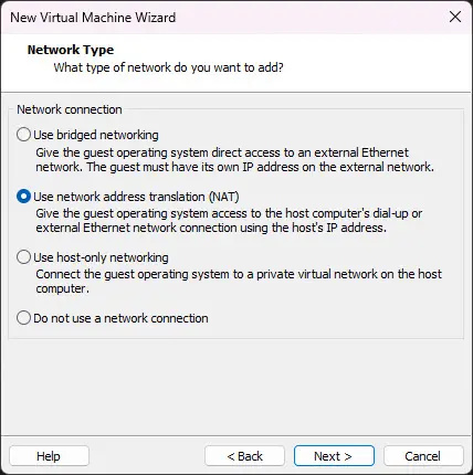 Select the network type for your Proxmox VM. One pesky thing I don’t like about the VMware Workstation wizard is that it doesn’t allow you to choose a Custom network type from this screen. Instead, I am just leaving set to NAT and then will customize below.