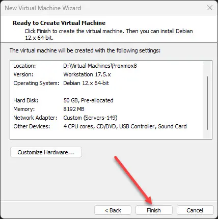 Once you have the options configured and click OK above, it will return you to the Ready to Create Virtual Machine screen. Click Finish.