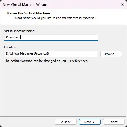 Next, name your new Proxmox virtual machine and set the location where the VM files will be stored.
