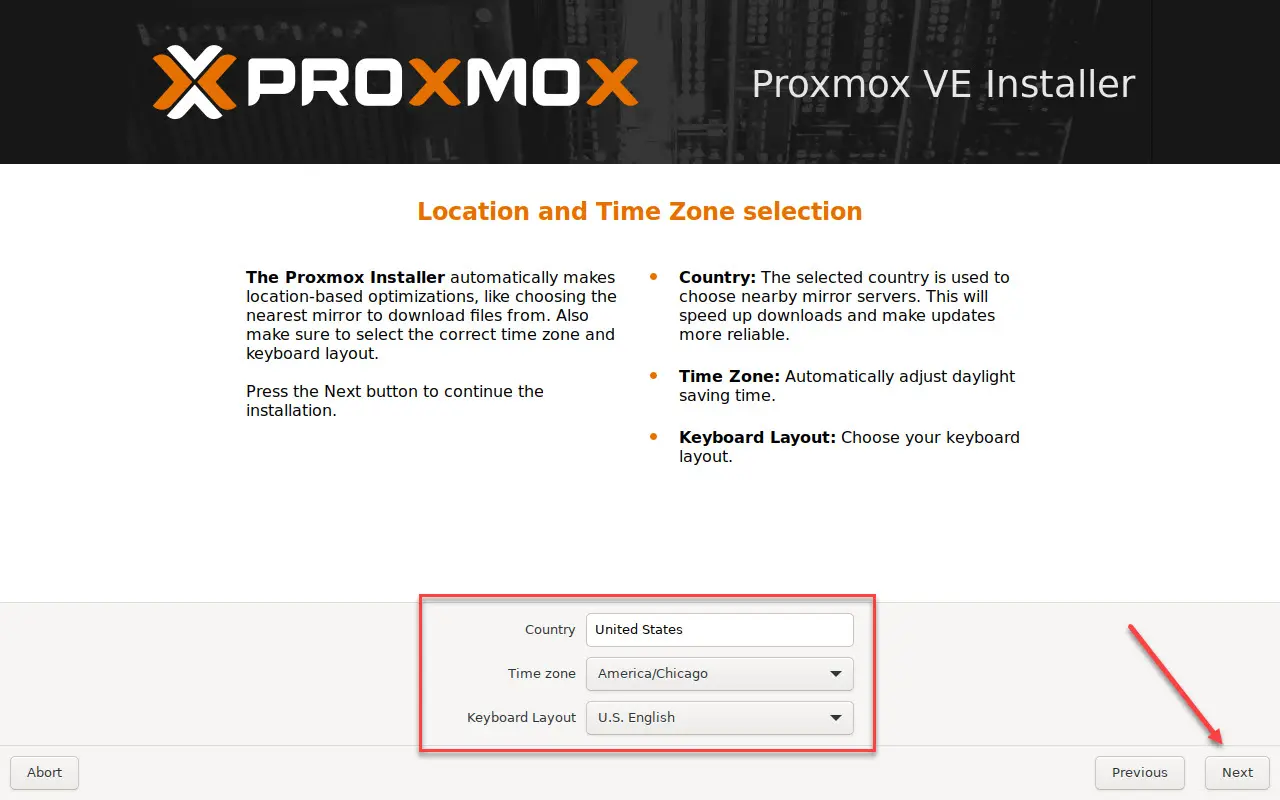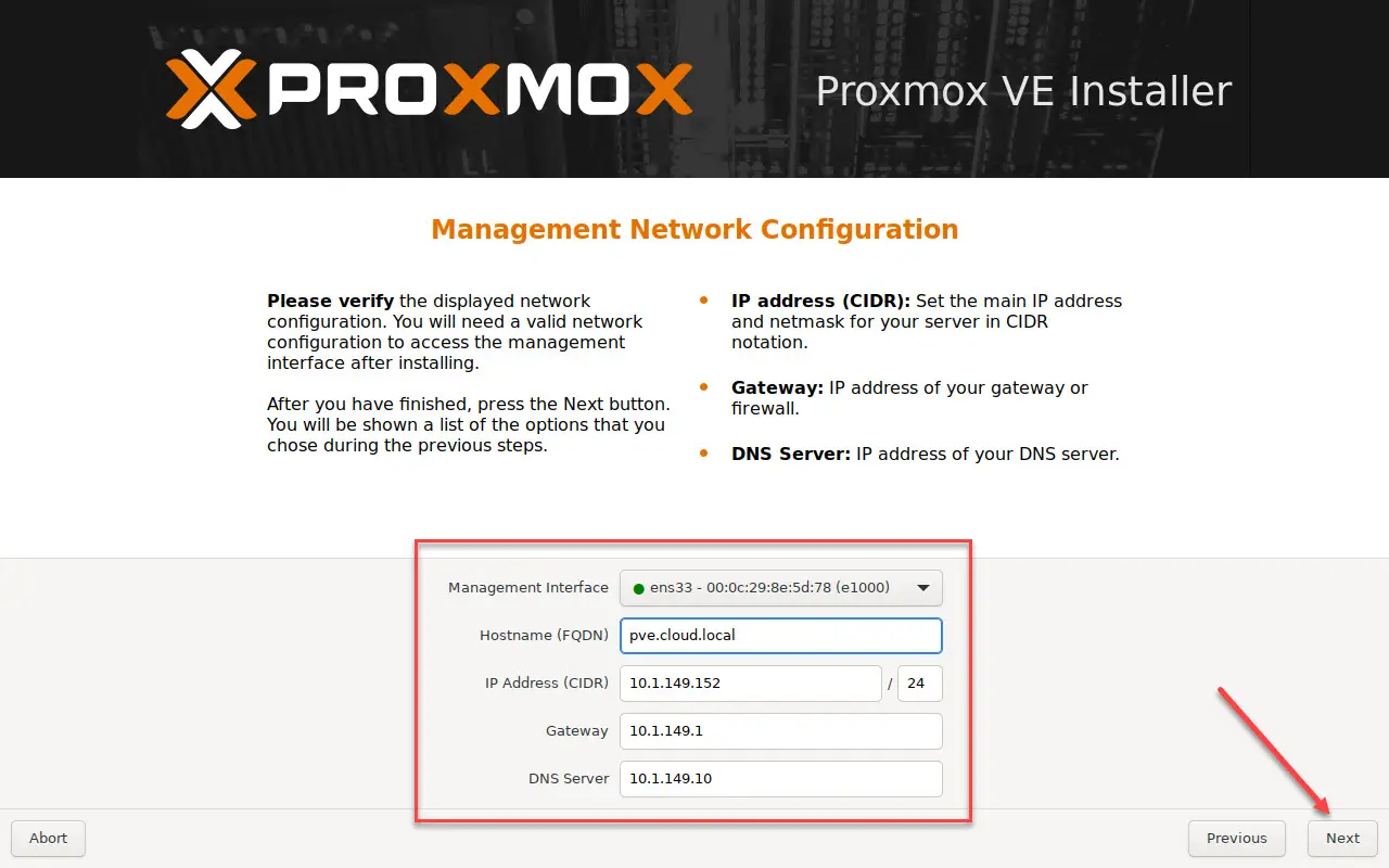 Set the hostname for your Proxmox server. It needs to be a proper FQDN to continue without error. Set the IP address, gateway, and DNS server. Then, click Next.