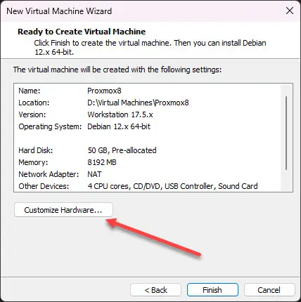 Now, on the Ready to Create Virtual Machine screen, I select Customize Hardware. For me, there are two things I need to do, change the network and enable nested virtualization. If you want to leave the default network configuration and one of the options earlier is good for your environment, you just need to enable nested virtualization as we will see.