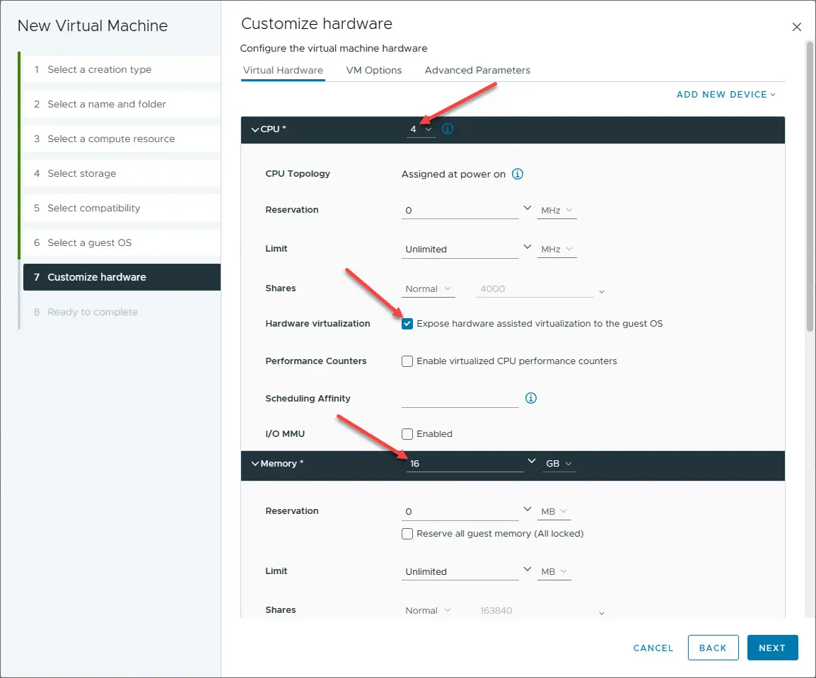 Below, you will see the CPU configuration and enabling Expose hardware-assisted virtualization to the guest OS. This is referred to as nested virtualization, which allows you to run a hypervisor inside a virtual machine.