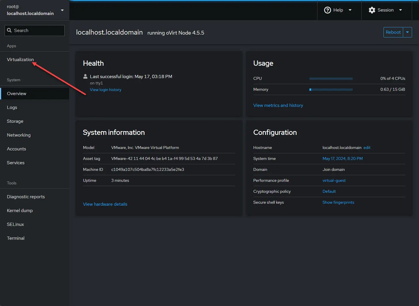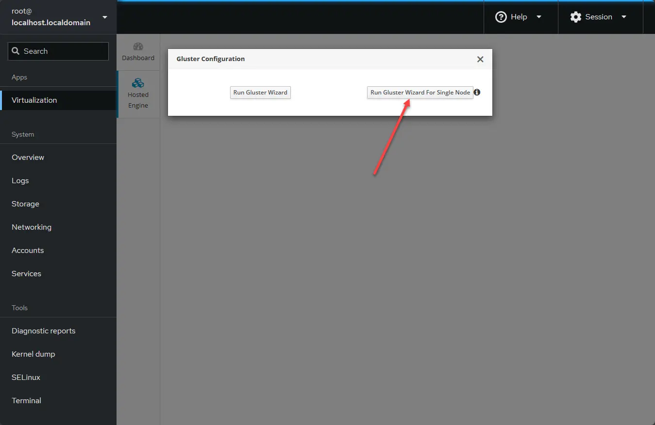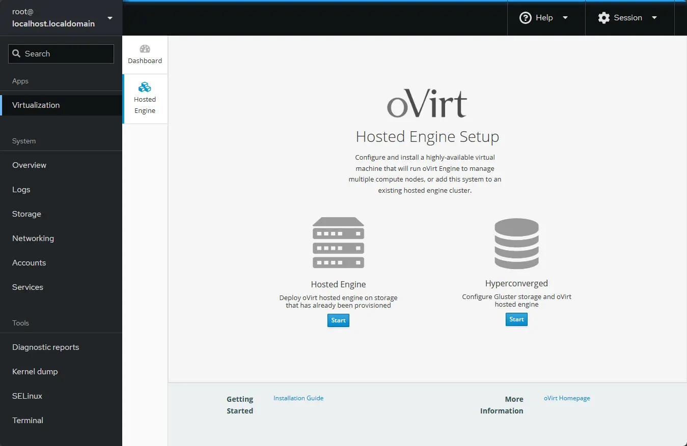 The next step we need to take is deploying the hosted engine. Click Virtualization and then click Hosted Engine.