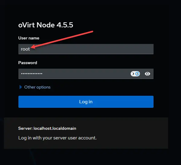Browse to the IP address of your oVirt Node installation and login with your root account that you set during the installation.
