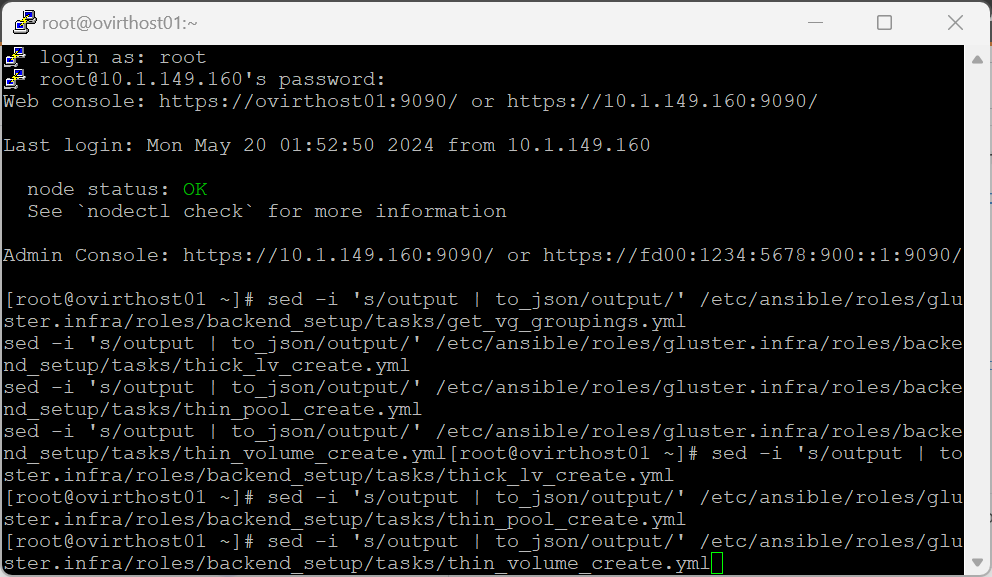 sed -i 's/output | to_json/output/' /etc/ansible/roles/gluster.infra/roles/backend_setup/tasks/thin_volume_create.yml