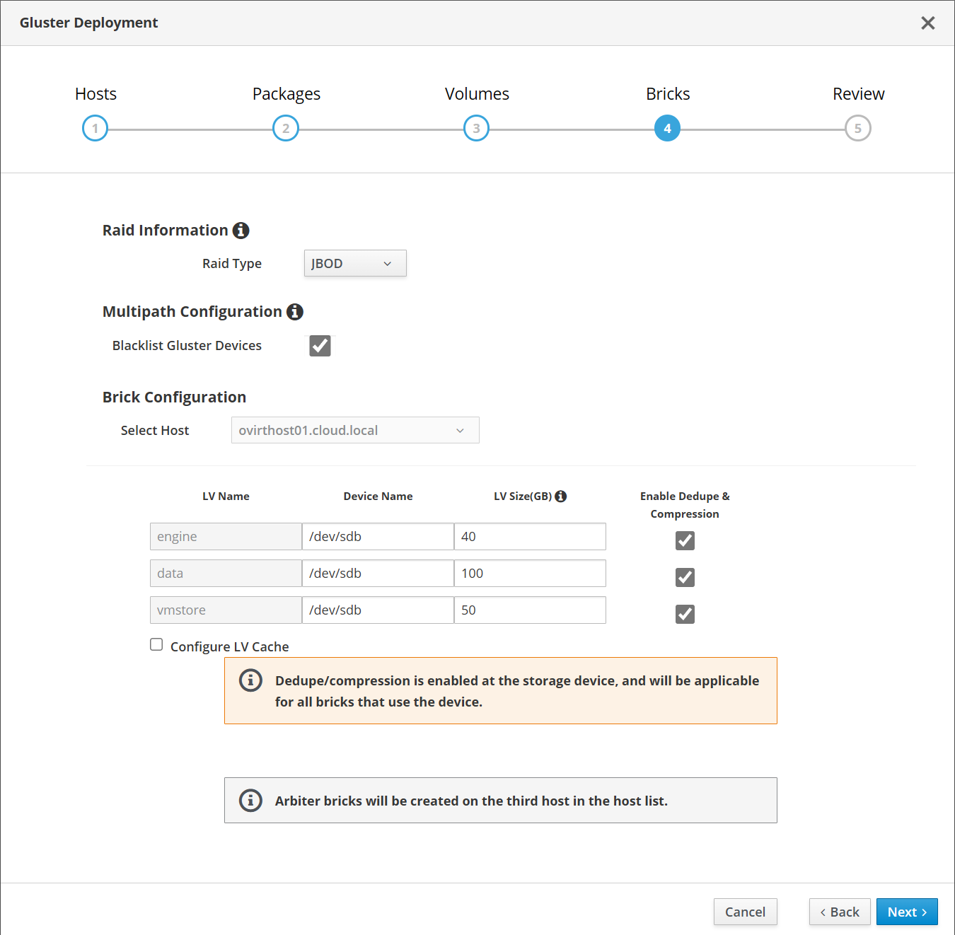 On the Bricks page, I changed to JBOD and then adjusted the sizes of the volumes according to the disk I had added to my oVirt host.