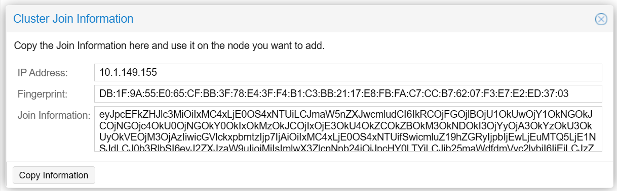 When you click the on the Join information button, you will see the Cluster Join Information dialog box. It will contain the IP address of the master cluster node, along with a long Join information hash that you need to copy. You will need this information on your subsequent Proxmox nodes that you want to join to the Proxmox cluster.