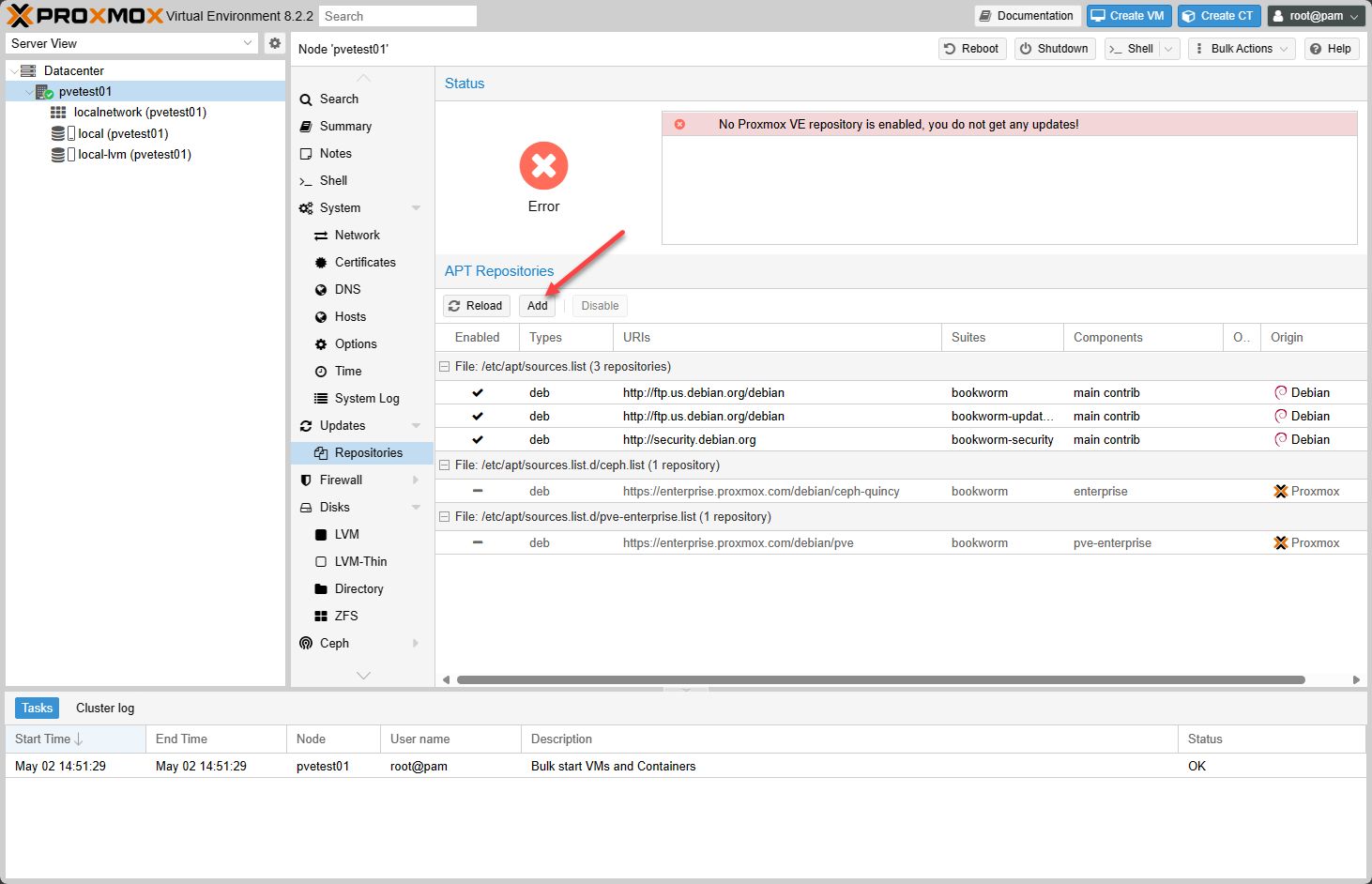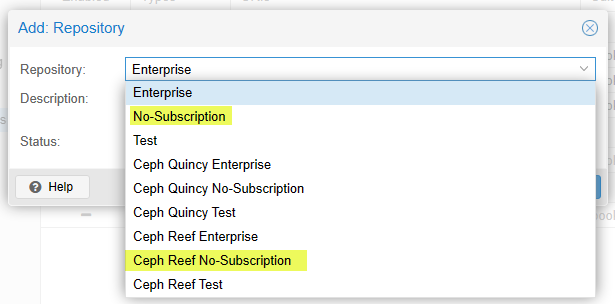 On the Add: Repository dialog box, add both the No-Subscription and Ceph Reef No-Subscription repositories. Note. Even if you are not using Ceph in your Proxmox installation, you need to change from the enterprise repository for Ceph to the non-enterprise repository, or you will encounter errors when pulling the latest updates.