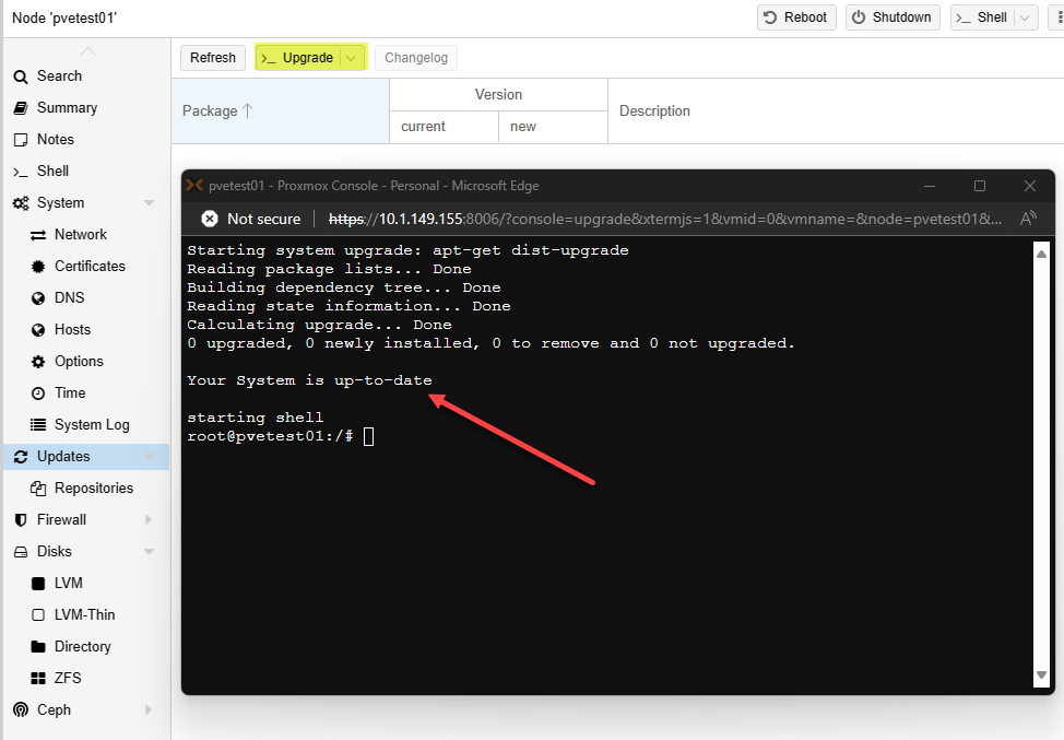 In addition to running updates from the command line, we can also check for and run updates from the web GUI. Navigate to your Proxmox host > Updates > Refresh to check for new updates.
