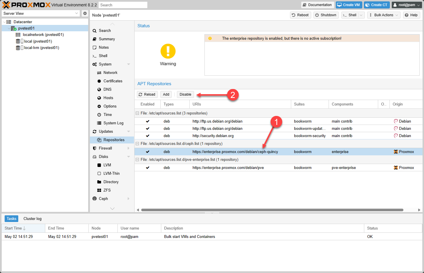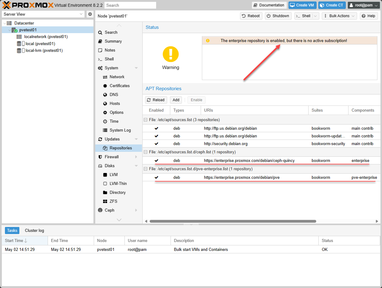 If you navigate to the Proxmox host > Updates > Repositories node, you will see the message displayed, โThe enterprise repository is enabled, but there is no active subscription!โ. You can see the enterprise repositories are configured by default for both the Proxmox core updates and Ceph.