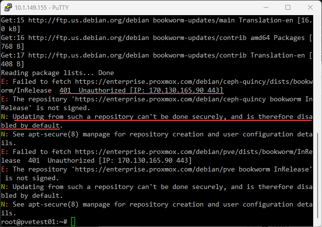 It is important to note that Proxmox is pointed to the enterprise repositories out of the box by default. The issue with this is if you want to make sure you have the latest updates for Proxmox, you will see errors if you donโt have a subscription, like below.
