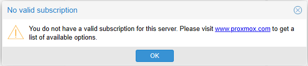 When you first install Proxmox and log in, the following dialog box pops up, noting you do not have a valid subscription. This is the default behavior.