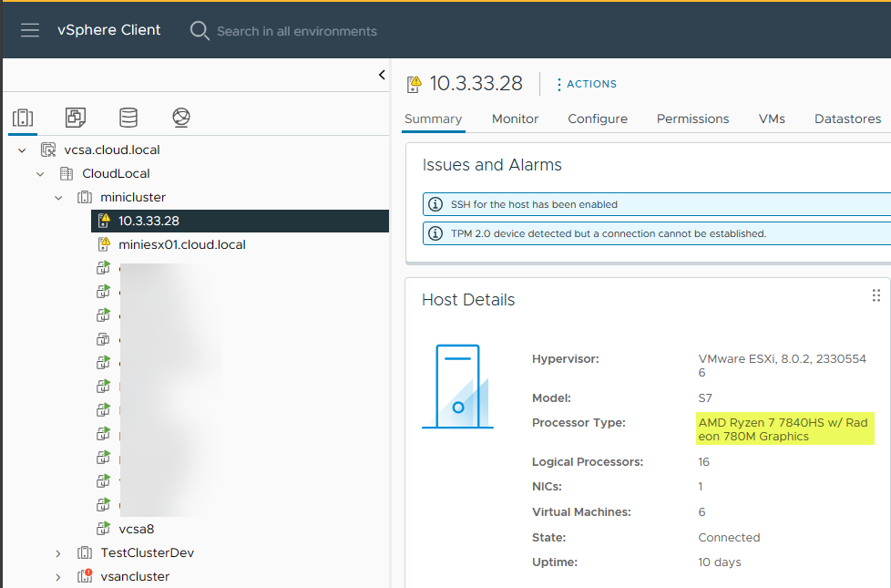 Below, you can see the AMD Ryzen 7840HS processor mini PC in the host summary and the host’s resources.