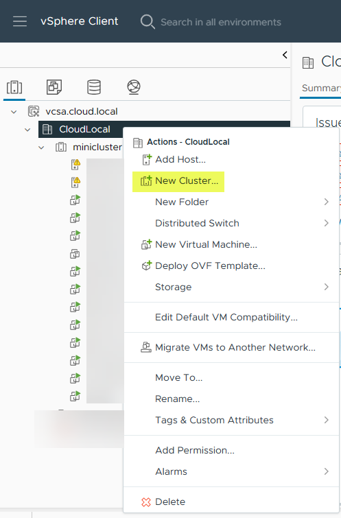 Once you deploy vCenter Server on a single ESXi host, you will be able to proceed with cluster creation by creating a new data center in vSphere and a new cluster object.